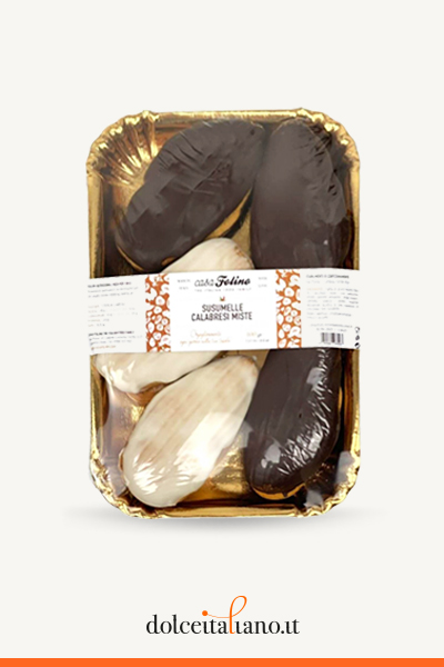 Susumelle are a typical Calabrian sweet, made with honey and spices and covered in white and dark chocolate. They are oval-shaped and slightly flattened, a typical Christmas sweet that cannot be missing in everyone's home. Thanks to their sweet dough, the sultanas they contain and the chocolate coating, they are a real treat for the palate. Produced with carefully selected ingredients.