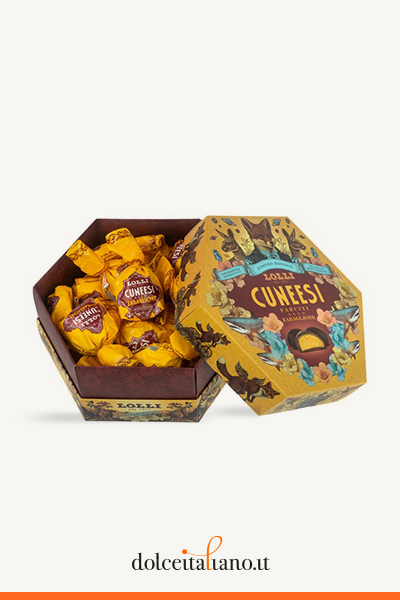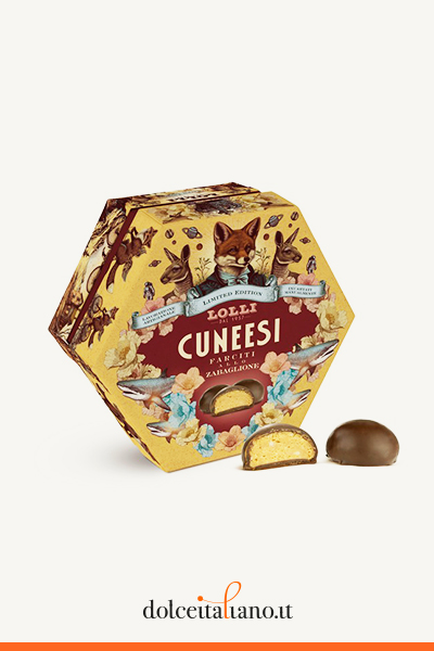 A wonderful Lolli Zabaglione variant of the traditional Cuneesi chocolates: an enveloping sweetness, balancing the full-bodied flavour of chocolate with the dense, rounded creaminess of Lolli Zabaglione liqueur. Packaged in an elegant hexagonal box, entirely graphicised in the style of Lolli Limited Edition products.