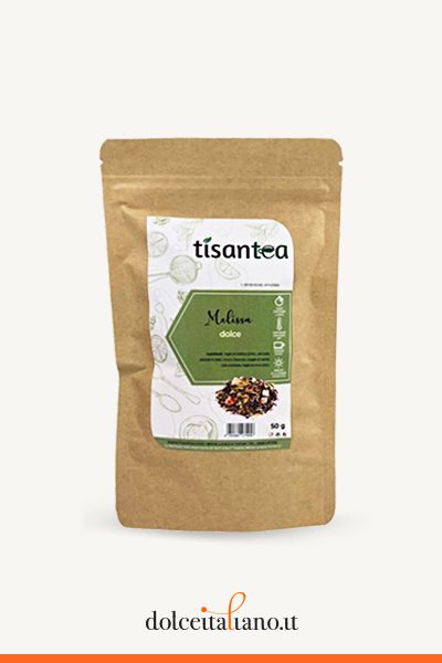 Ingredienti: foglie di melissa (20%), citronella, mela a pezzetti, scorza di arancia, scaglie di carota, limone, mirto, foglie di mora dolce.