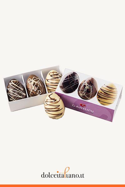 Tre ovetti di cioccolato bianco/fondente/al latte variegati a mano con cioccolato. Un piccolo raffinato scrigno, il regalo ideale per una famiglia.