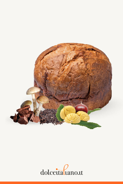 Lievitato con infuso di tè Pu-erh, funghi chiodini canditi dei Monti Alburni, marron glacè e cioccolato fondente 72%.