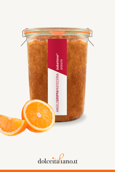 Babà lievitato con pasta madre, arancia candita e bagna all'arancia.